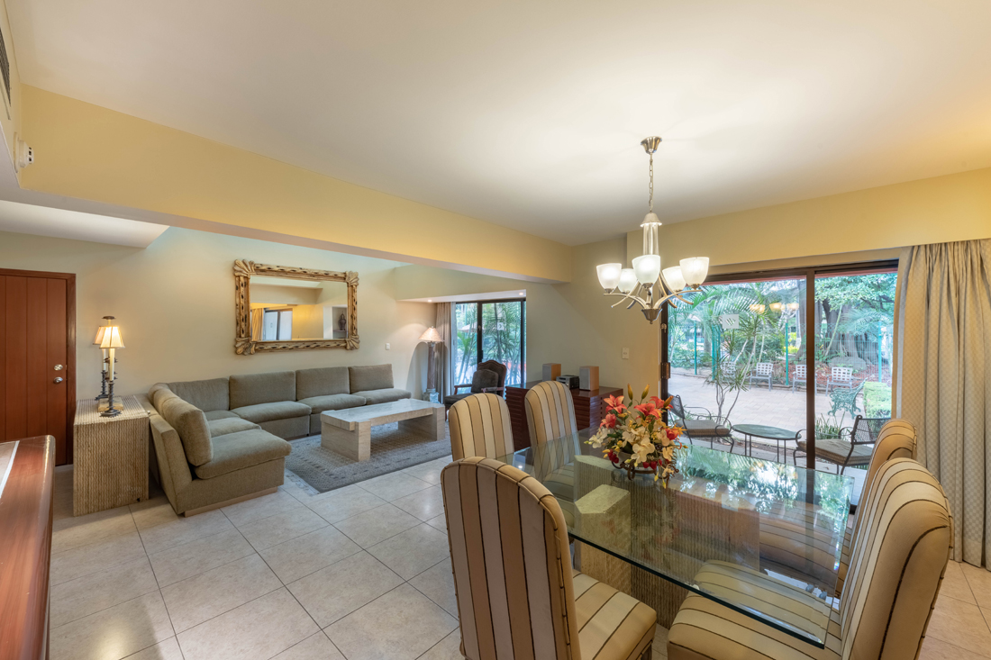 Hermosa suite libre de humo con vista a los jardines y amenidades de lujo, cuenta con dos niveles, en la planta baja tiene sala de estar con televisión, comedor, medio baño, segundo nivel amplia habitación con cama king size, baño con Jacuzzi.